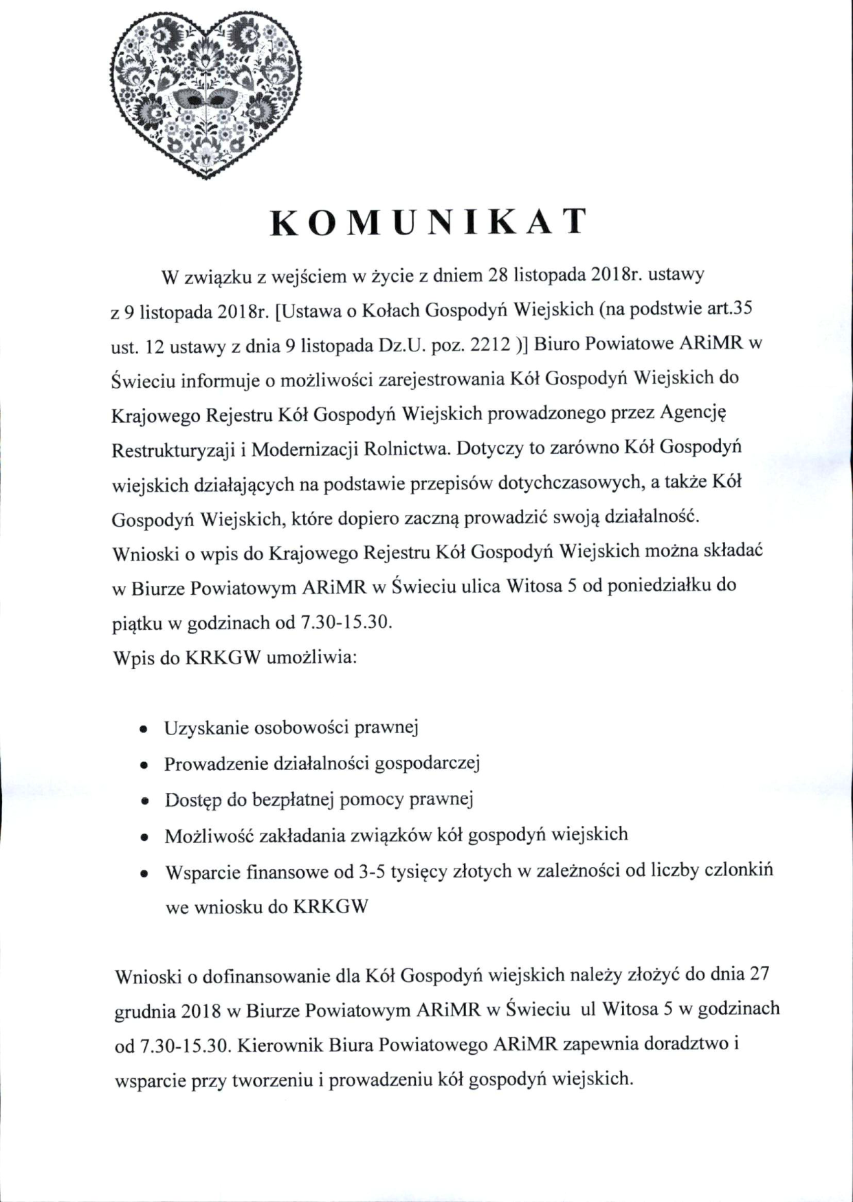 Dokumenty niezbędne do rejestracji Koła Gospodyń Wiejskich; wniosek o przyznanie pomocy; więcej informacji - otwórz