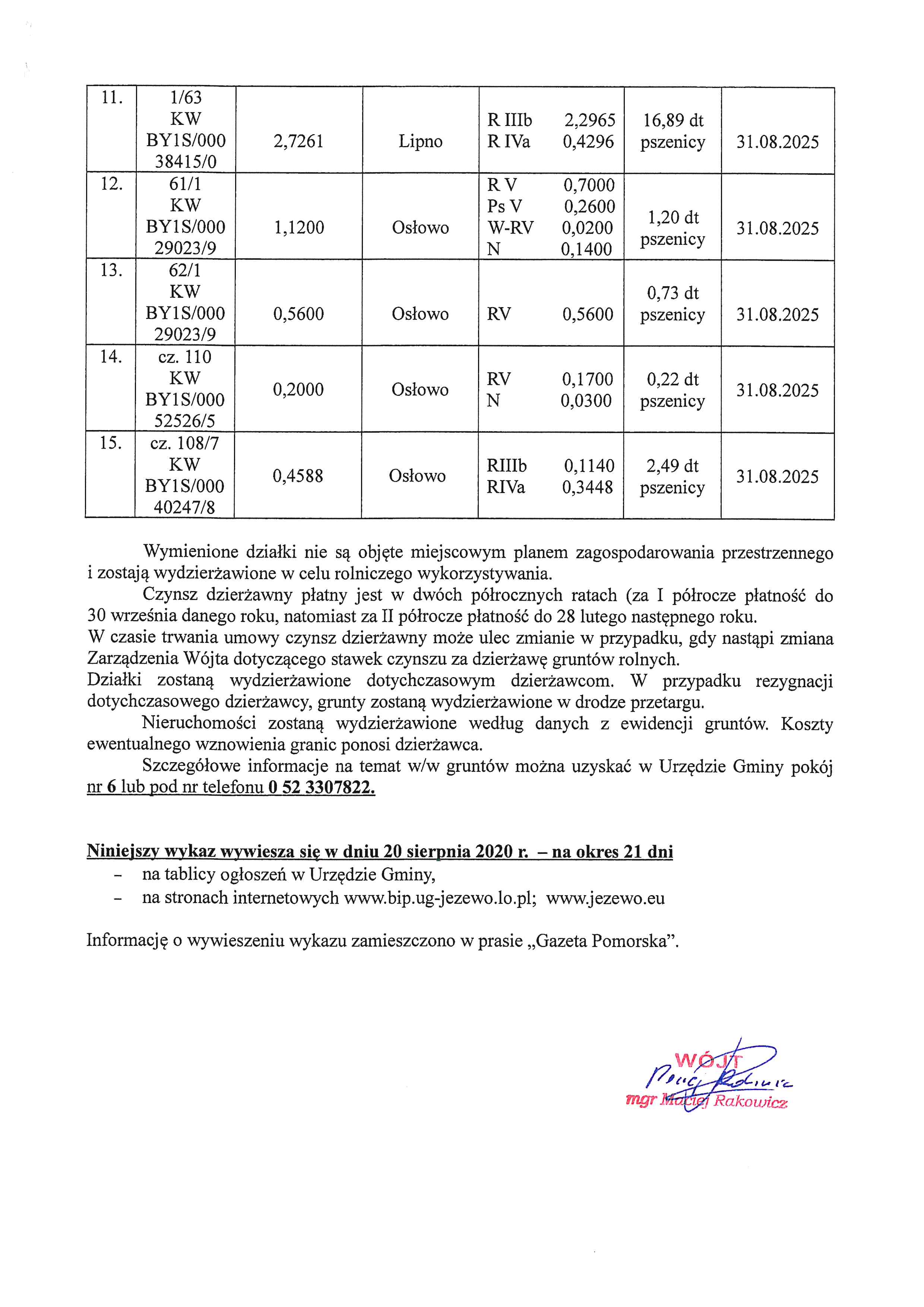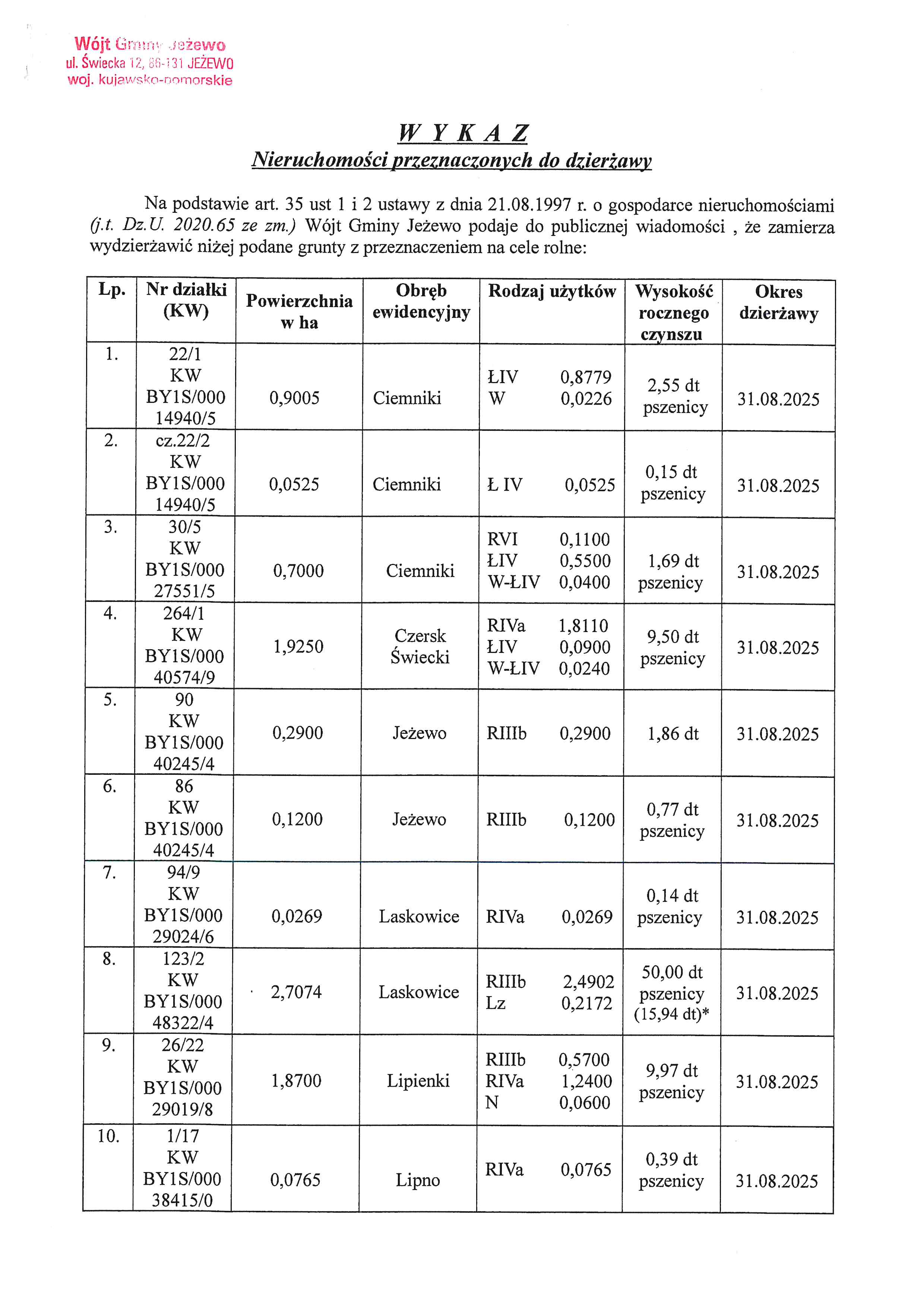 Wykaz nieruchomości przeznaczonych do dzierżawy 20.08.2020 r.