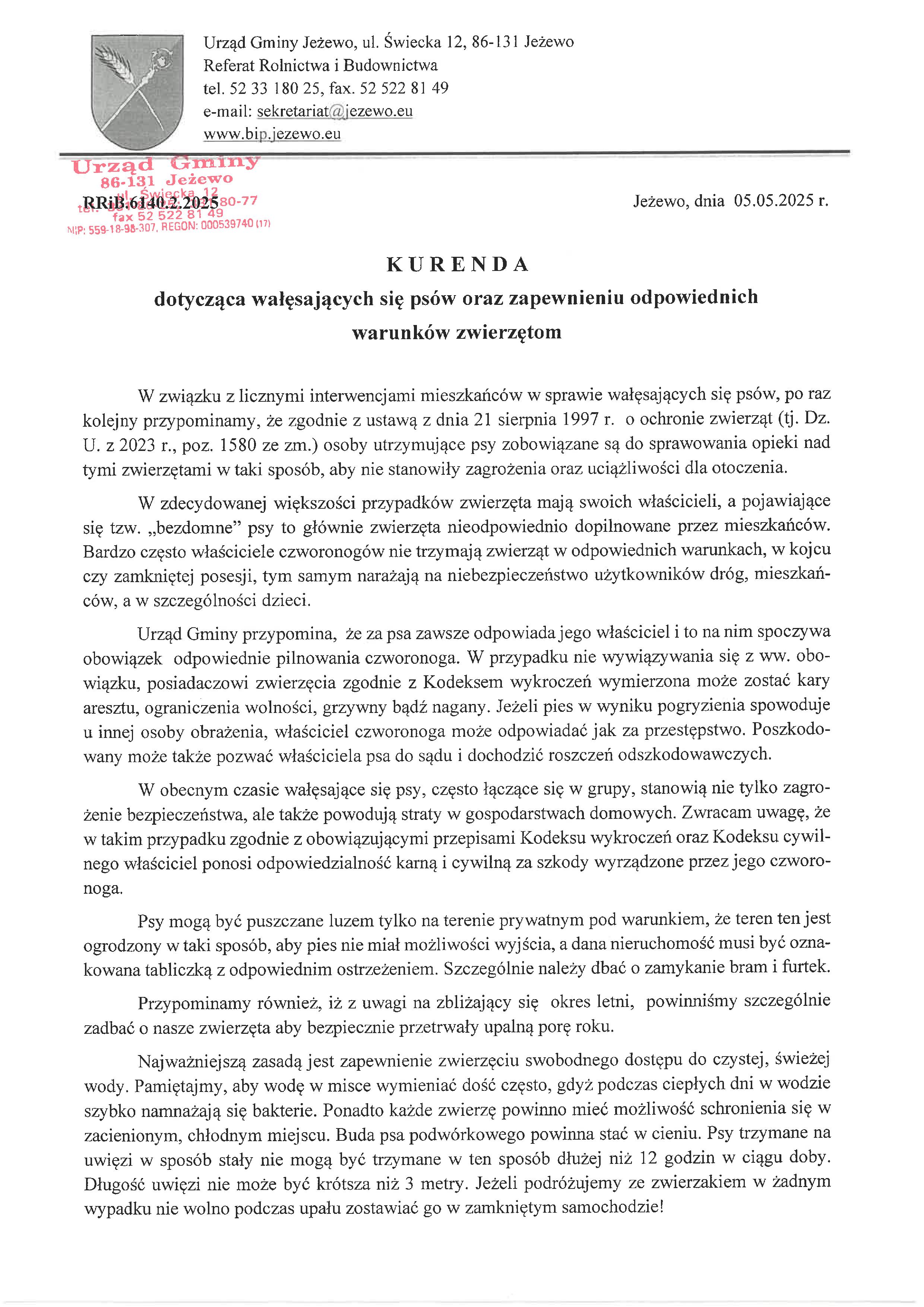 Kurenda dotycząca wałęsających się psów oraz zapewnienia odpowiednich warunków zwierzętom