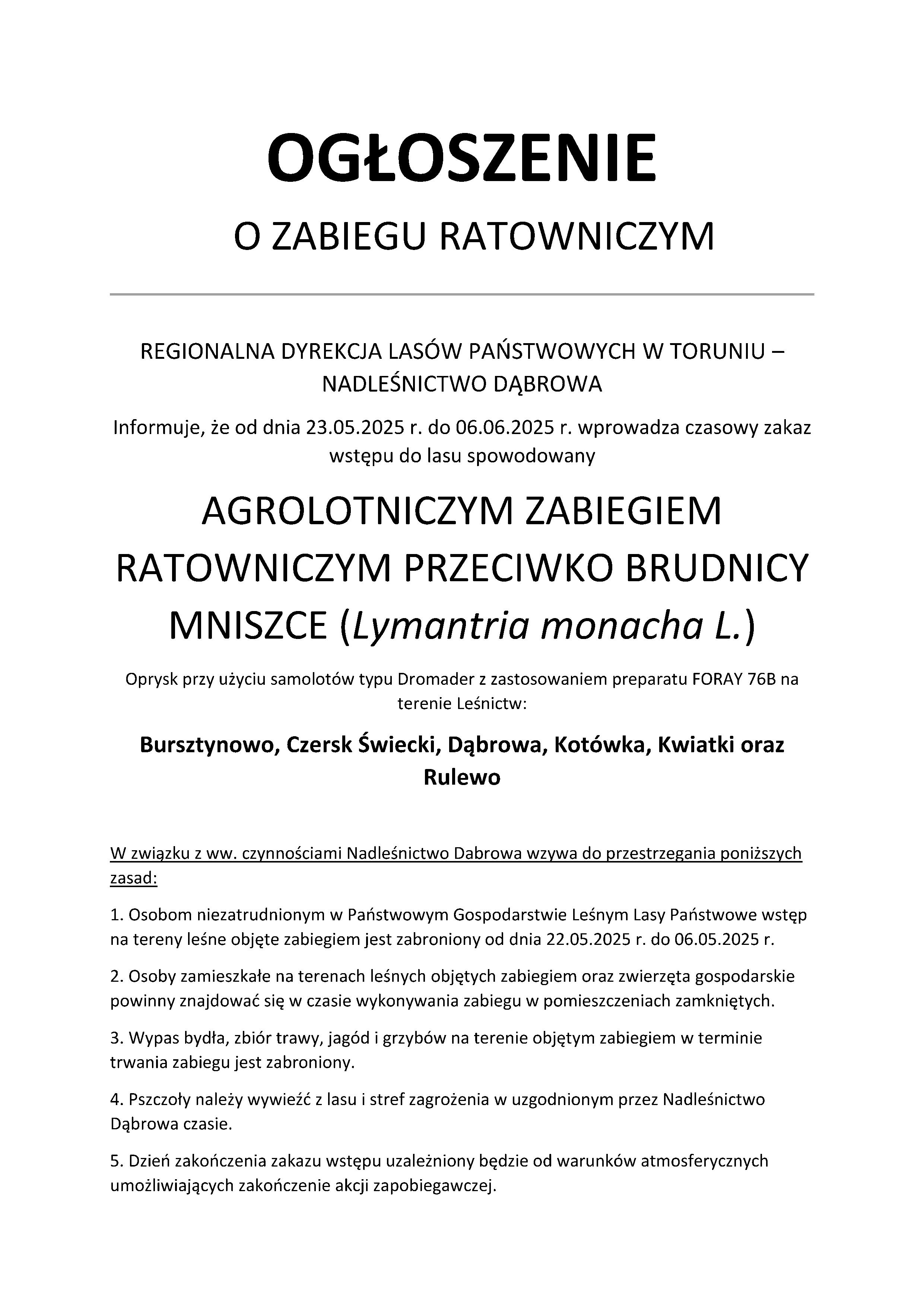 Zakaz wstępu do lasu w związku z opryskami ratowniczymi do 06.06.2025 r.