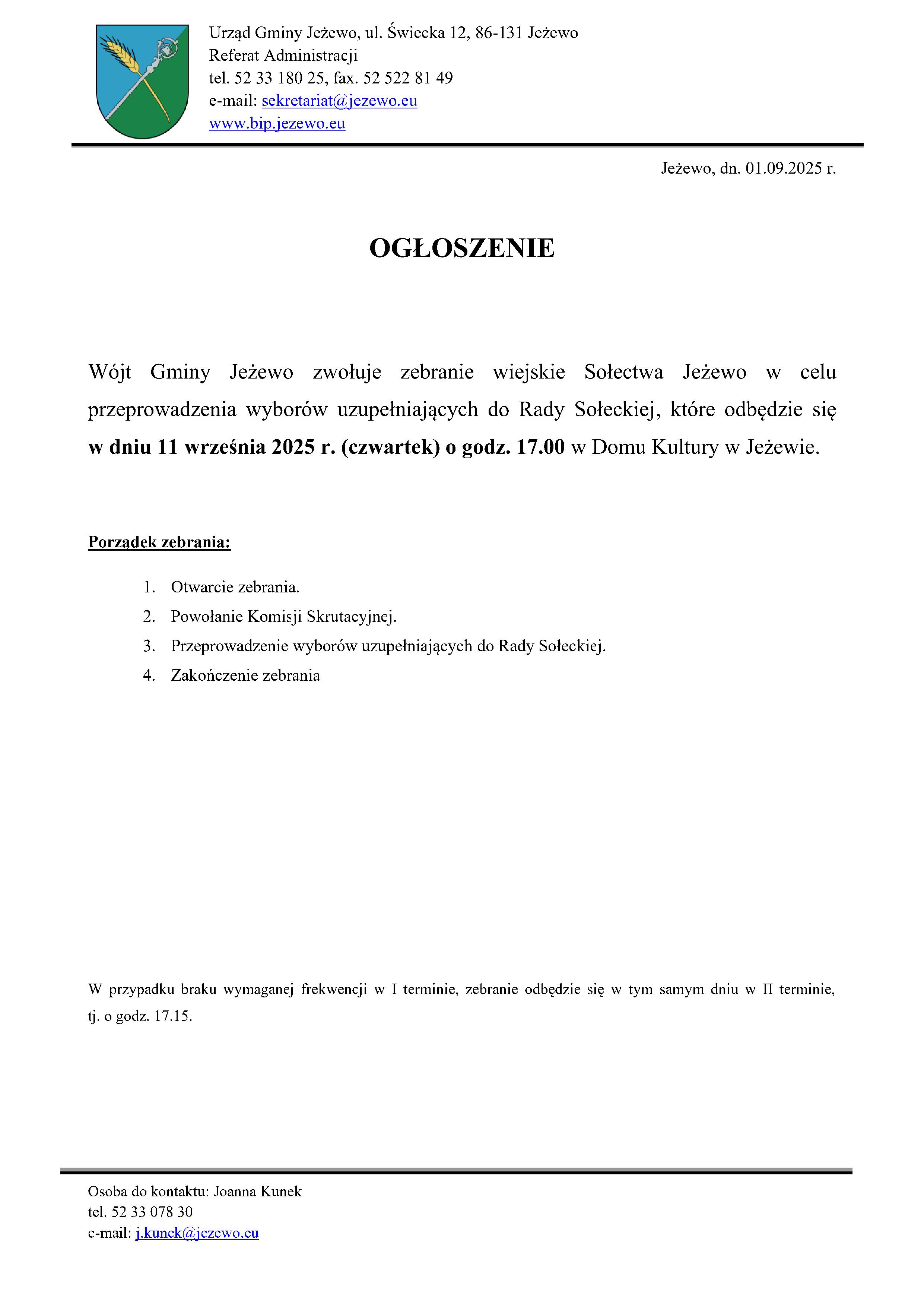 Informacja na temat zwołania zebrania wyborczego Sołectwa Jeżewo