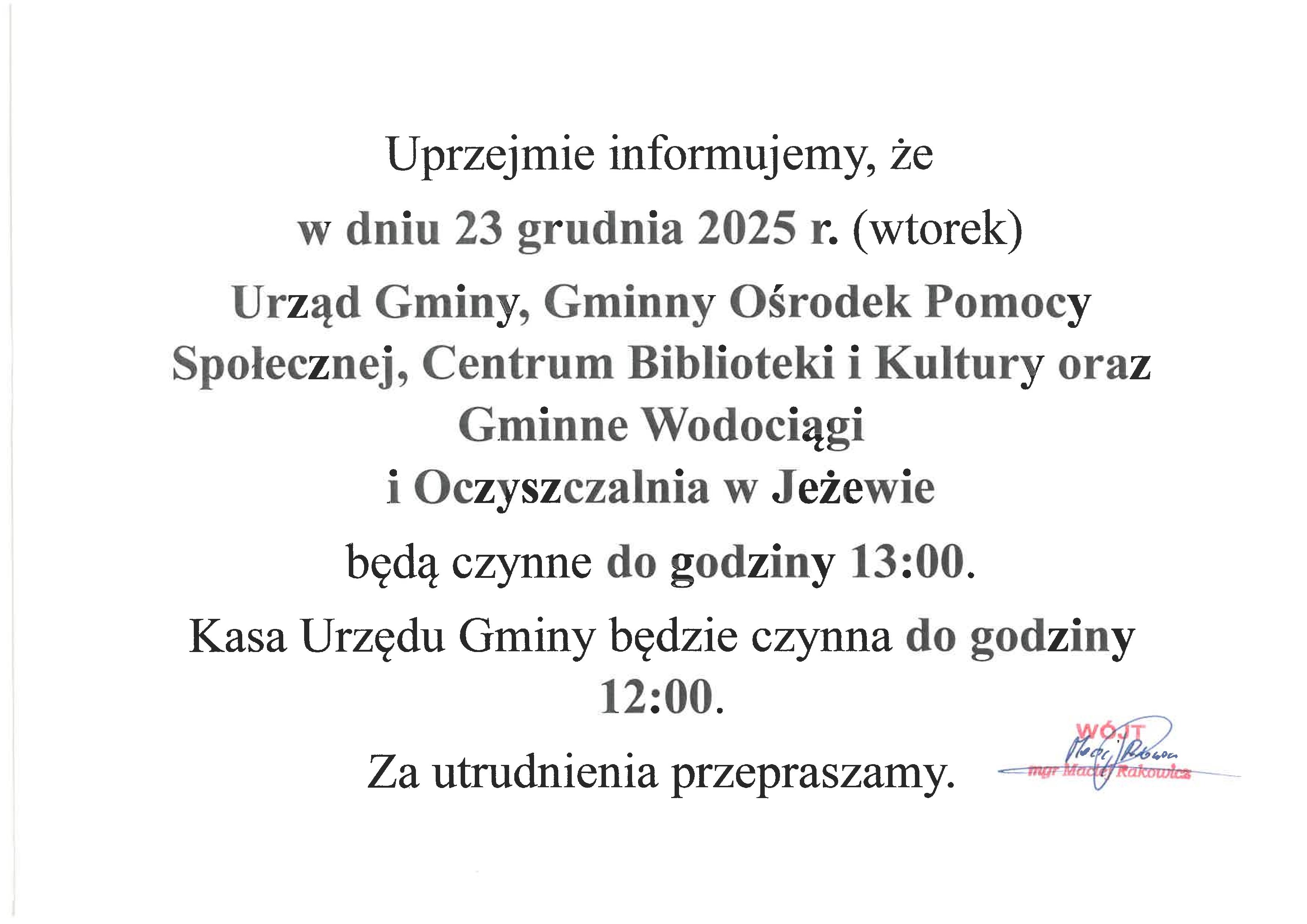 Informacja na temat pracy Urzędu i jednostek organizacyjnych w naszej Gminie w dniu 23 grudnia 2025 r.