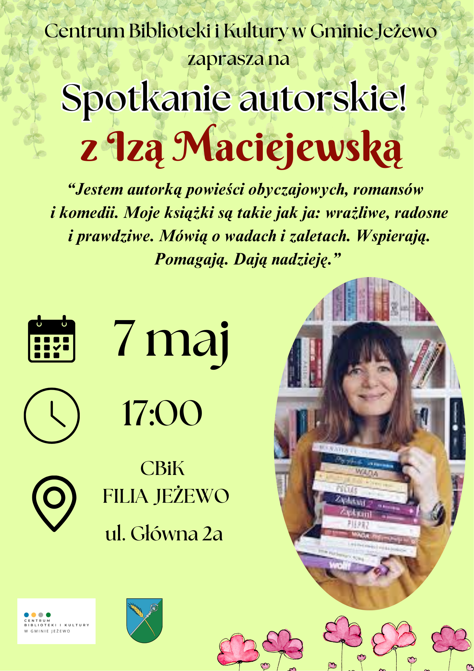 Centrum Biblioteki i Kultury w Gminie Jeżewo zaprasza na "Spotkanie autorskie! z Izą Maciejewską".