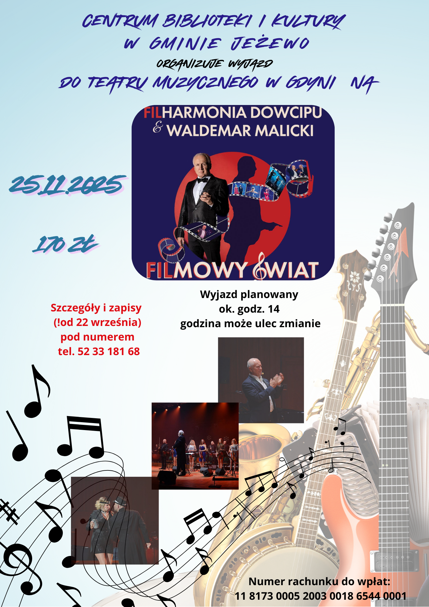 25 listopada, Centrum Biblioteki i Kultury w Gminie Jeżewo, organizuje wyjazd do Teatru Muzycznego w Gdyni na wyjątkowy spektakl Filharmonia Dowcipu & Waldemar Malicki – „Filmowy Świat”!