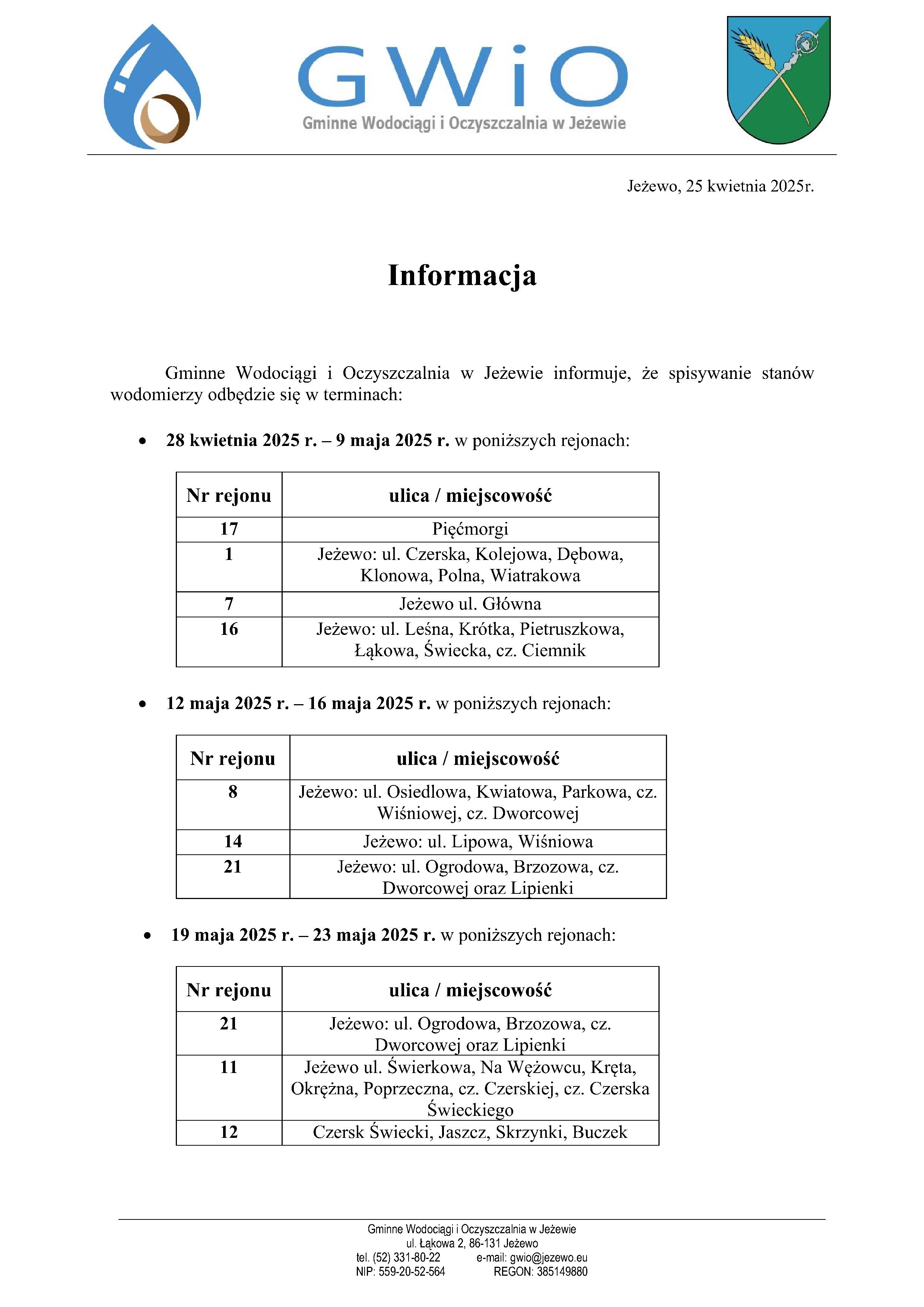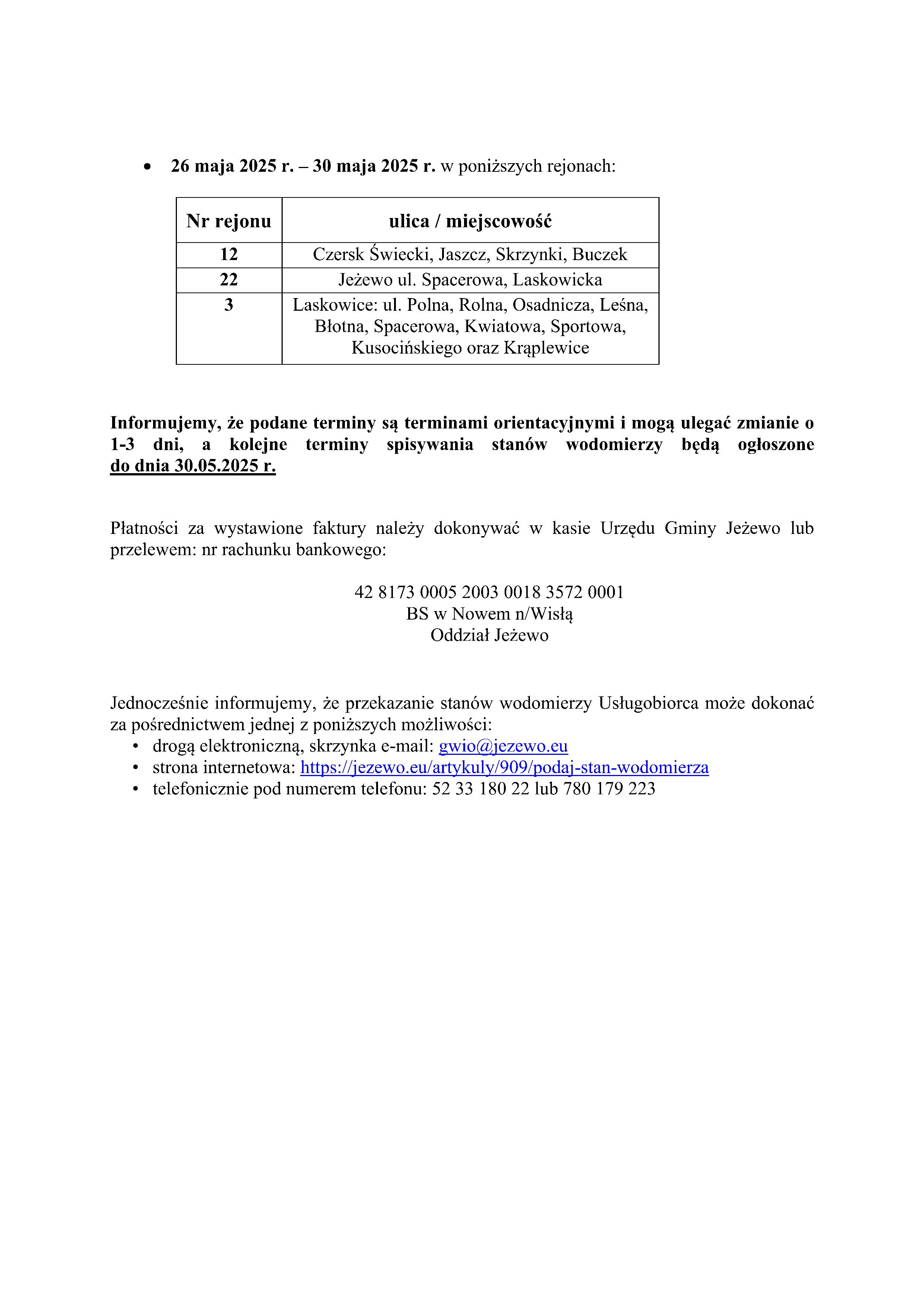 Terminy spisywania wodomierzy 25.04.2025