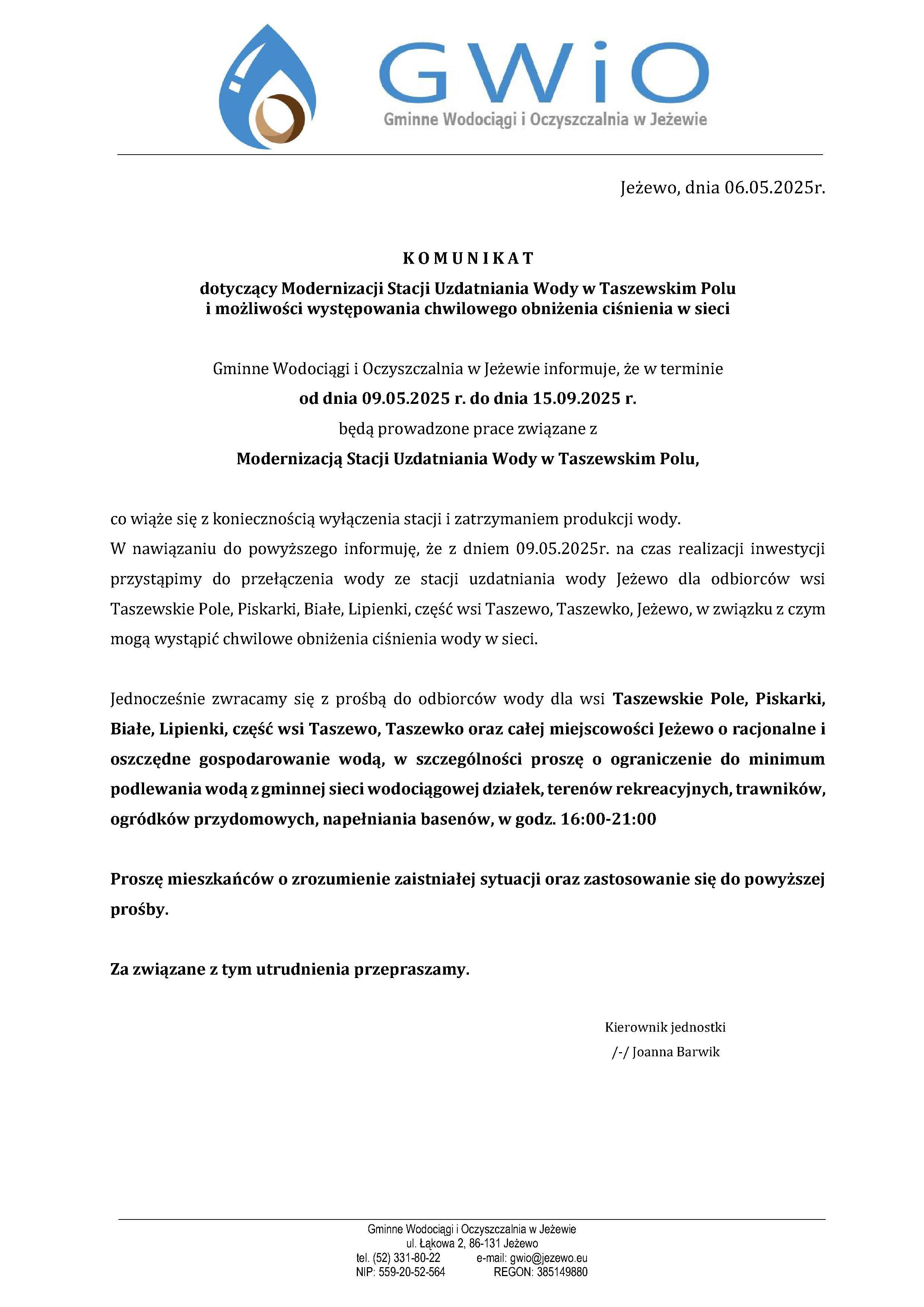 Komunikat od Gminnych Wodociągów i Oczyszczalni w Jeżewie