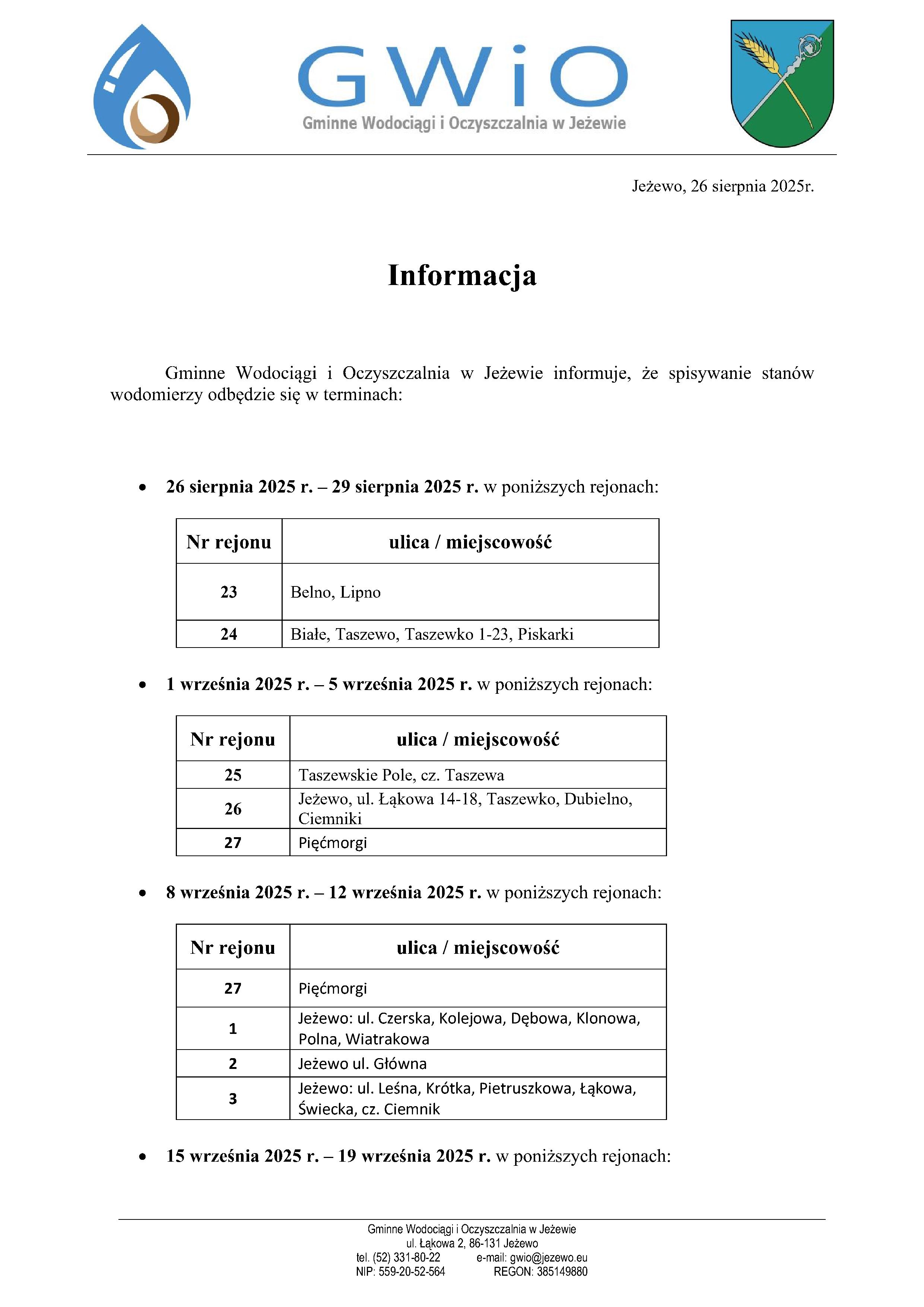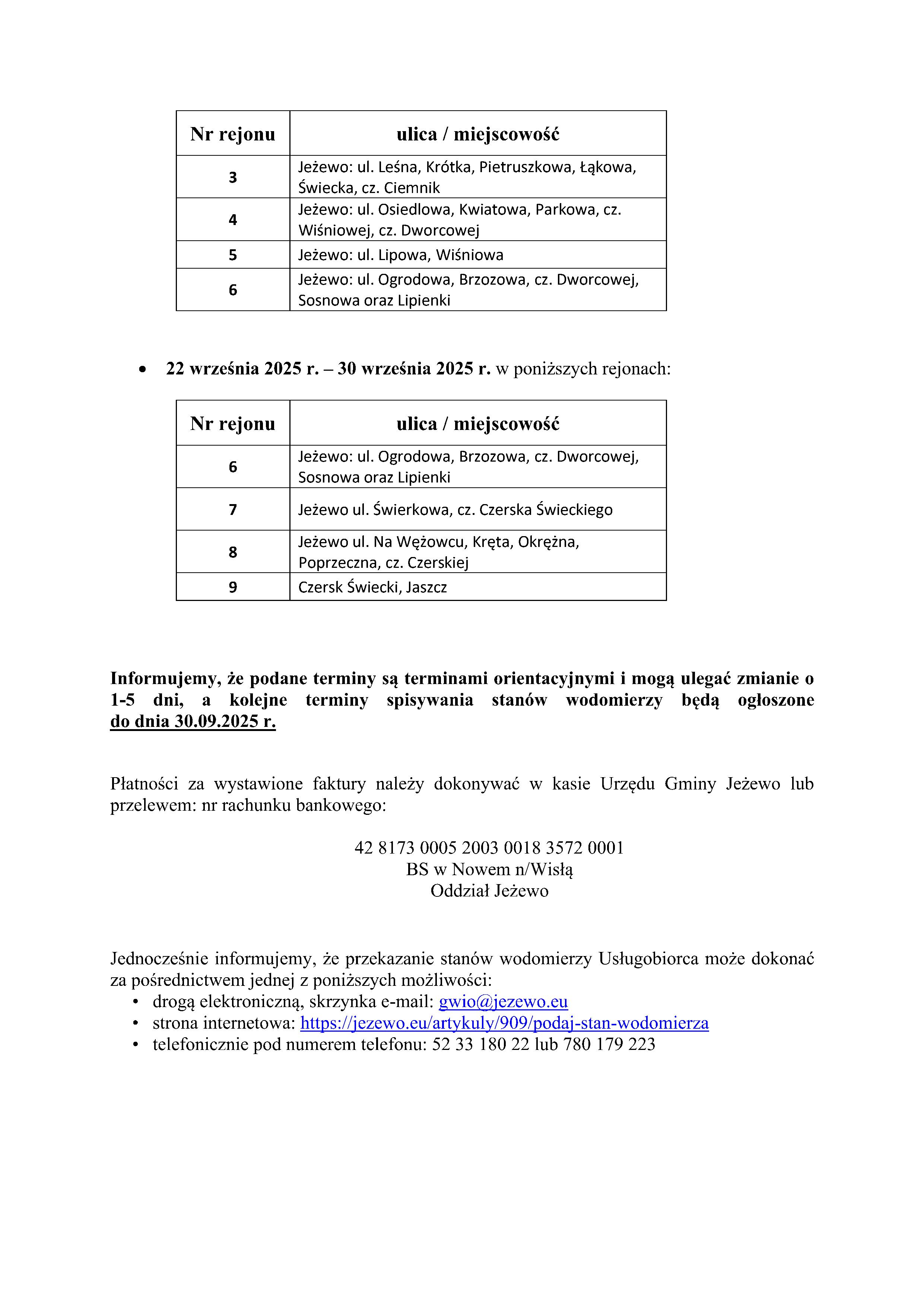 Terminy spisywania wodomierzy 26.08.2025
