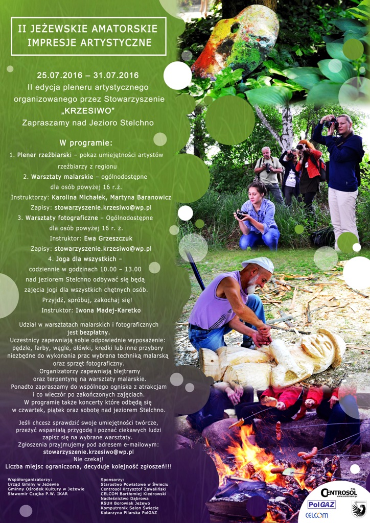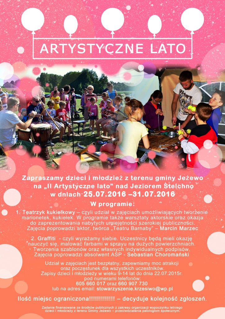Podobnie jak w roku ubiegłym równolegle będą odbywały się zajęcia w ramach „II Artystycznego lata”. Przeznaczone dla dzieci i młodzież z terenu gminy Jeżewo.