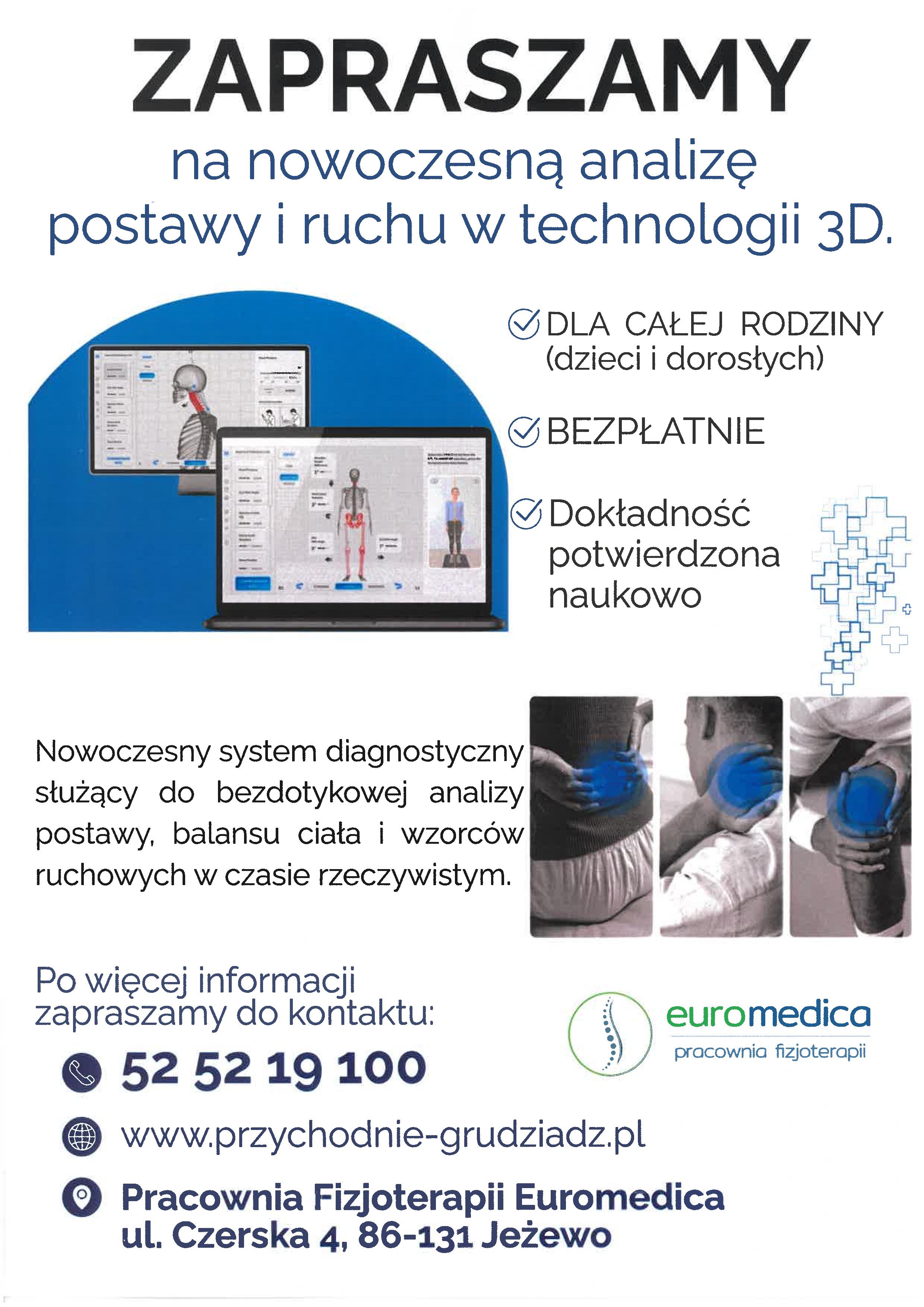 Pracownia Fizjoterapii Euromedica w Jeżewie zaprasza na bezpłatne analizy postawy i ruchu z wykorzystaniem technologii 3D. Zgłaszać się mogą osoby w każdym wieku, które posiadają minimum 140 cm wzrostu. Oferta ważna jest tylko do 5 listopada 2025 roku. Szczegółowe informacje można uzyskać pod numerem telefonu 52 52 19 100.