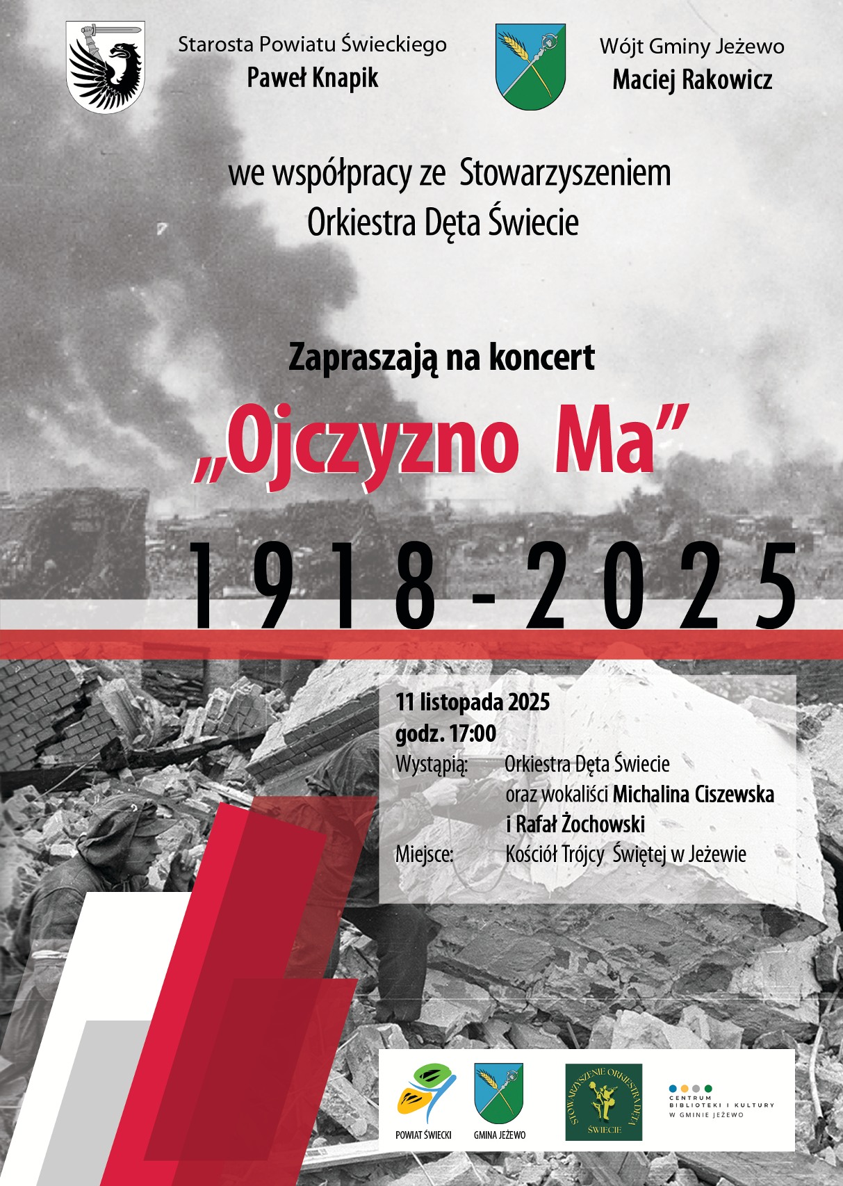 Wójt Gminy Jeżewo Maciej Rakowicz wraz ze Starostą Powiatu Świeckiego Pawłem Knapikiem serdecznie zapraszają na wyjątkowy koncert „Ojczyzno Ma”, który odbędzie się z okazji obchodów Święta Niepodległości.