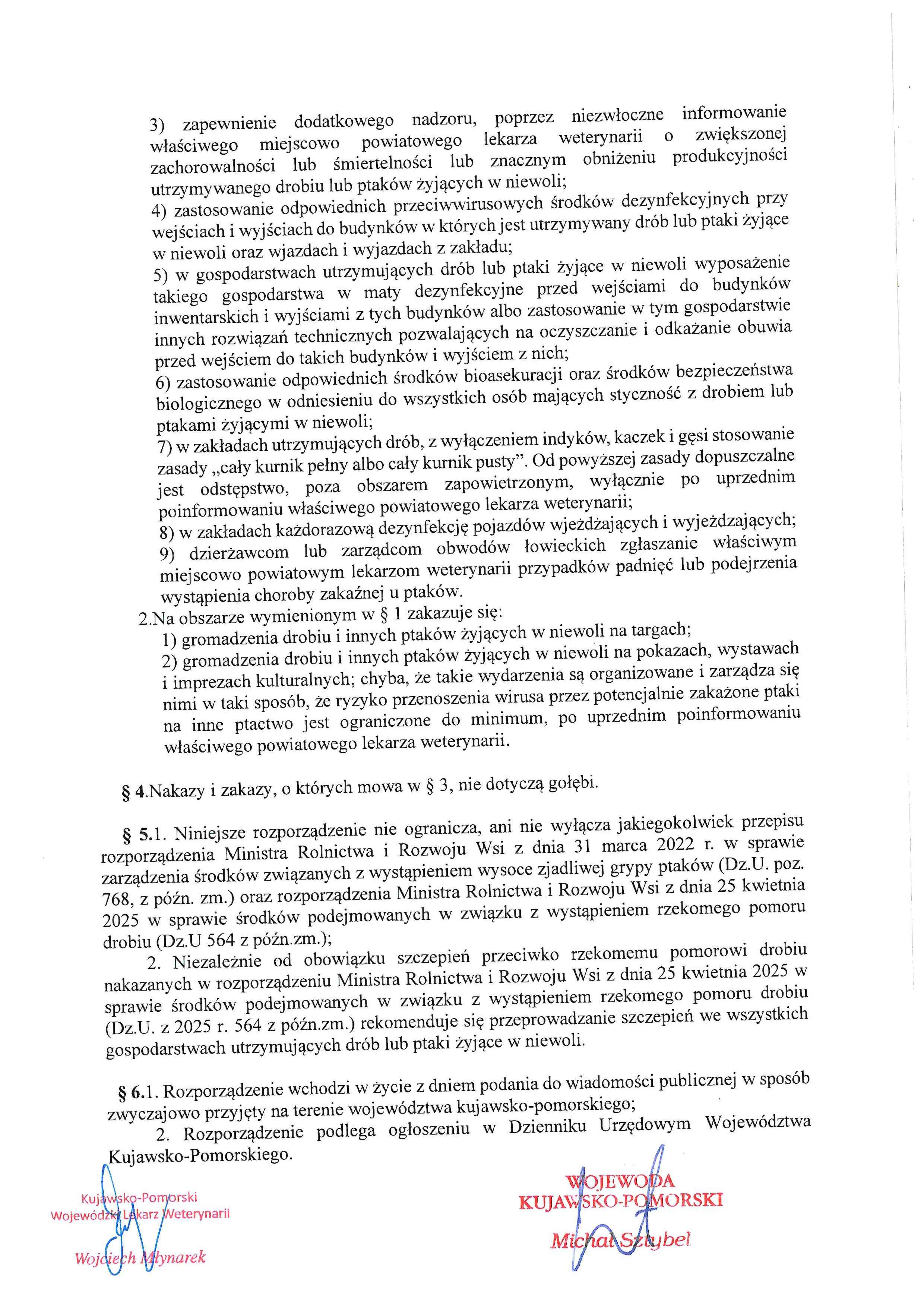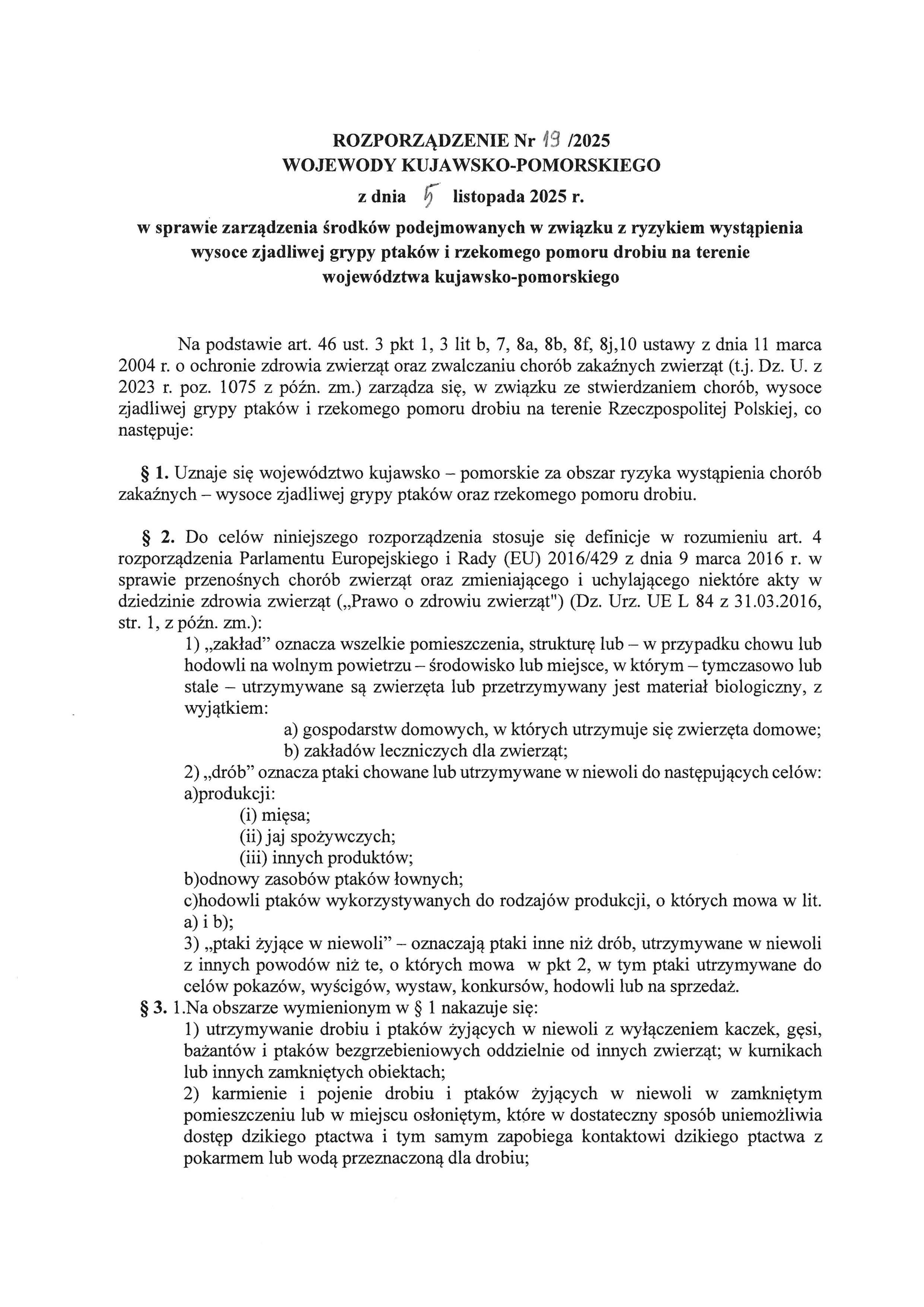 Publikujemy Rozporządzenie nr 19/2025 Wojewody Kujawsko-Pomorskiego z dnia 5 listopada 2025 r. w sprawie zarządzenia środków podejmowanych w związku z ryzykiem wystąpienia wysoce zjadliwej grypy ptaków i rzekomego pomoru drobiu na terenie województwa kujawsko-pomorskiego.